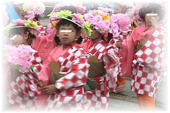 | 門司港を中心に門司全域で行われる。 もともとは5月3日・4日にあっていたが、現在は門司海峡フェスタをしているので、5月第四日曜日と前日の土曜日に行われている。掲載写真は、パレードの時の、写真です。錦町地区のしゃぎりです。 女の子が赤と白の着物を着て、しゃもじを持っています。花の着いた笠をかぶっています。 |
