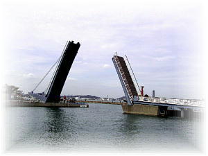日本唯一の歩行者用跳ね橋で、 全長108メートル、 平成5年(1993年)に完成。開橋時間は、10時・11時・ 14時・15時。 船が通る時は、 親橋約24メートルと子橋約14メートルの橋が、水面と約60度の角度に跳ね上がる。開橋時間は毎回約20分。 最近は、自転車で渡る人が、います。自転車は、押してください。と看板が出ています。歩行者専用では、なくなっています。 名前のとおり、青い跳ね橋です。 この橋は、スロープが付いていますので、車椅子でも大丈夫のようです。