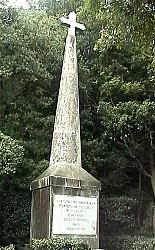 864年の四ヶ国艦隊による下関砲撃に参加した、仏軍艦セミラミス号とデュプレックス号の戦死者を弔うために、1895年もじを訪れた仏人宣教師ビリオン神父により建立された慰霊碑。 場所:めかり公園内 めかり塩水プール前バス停下車。 案内板は出ているが、見逃しそうです。高さが3メートルくらいありそう です、上が十字架になっています。円柱形になっていて、下から1メートルくらいが正方形の「碑」です。